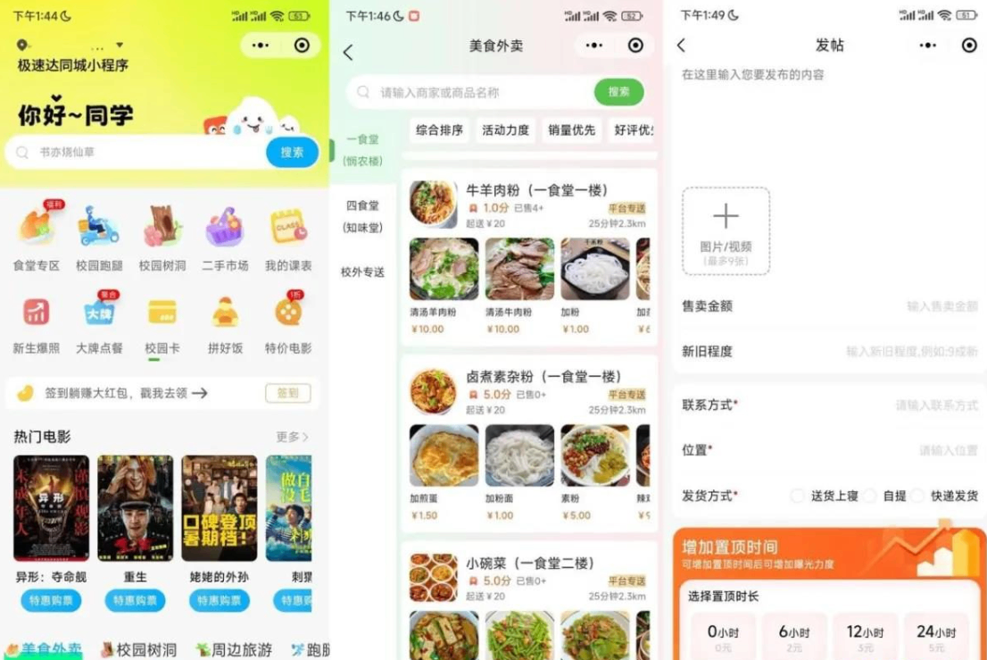 程序介绍极速达同城系统是一个集外卖、跑腿、电影票、快递、校园卡、驾校、社交交友和二手交易等服务于一体的校园综合平台。我们提供小程序端、APP端和公众号端,支持骑手跑腿端、骑手外卖端、客户端和商家端。后台支持自定义布局,并支持多校园和多商家管理。本次更新采用了全新的框架和后台设计,暂时不支持直接系统更新。